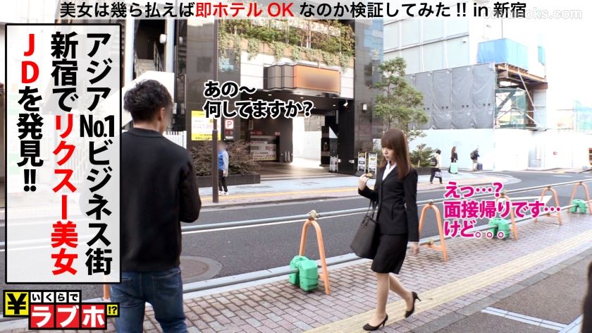 某You●uberよろしく体当たりガチ企画、「美女は幾ら払えば即ラブホテルOKなのか検証してみた!in新宿」開催!日本中、いや、今や世界中の美女が集まるビッグタウン、新宿でガチナンパ。世界に誇るビジネスシティ新宿でナンパ!!とりあえずランチタイムの昼休憩でサクッと出てくれるOLちゃんを…と思ったけど、そんな上手くは行かず失敗の連続で半泣きwwその時、今日1番の美女が我々の目の前に!!玉砕覚悟でナンパ!!ピチ尻美女くるみちゃんをゴリ押しでGET!?「もう面接終わってヒマです~」と、就活中JDと発覚!!どおりでフレッシュな訳だww夜行バスではるばる東北から東京で就活する彼女!!「とりあえず青山住む!!家賃5万あれば平気?」と、夢見るリクスーJDに「面接の練習しよ!!」とラブホへGO!!なんかゴリ押しに弱そうなんで、大人の圧迫面接開始っすwwくるみちゃんもノリ気なのか、透けブラ発覚!!しかも、情熱の赤!!積極的な姿勢に思わず勃起!!一次面接の勃起試験は合格、次は実地試験で感度の方を…「もっと触って…♥」と、なんと彼女の方からパンツの方へ導いてくれました!!積極的な姿勢